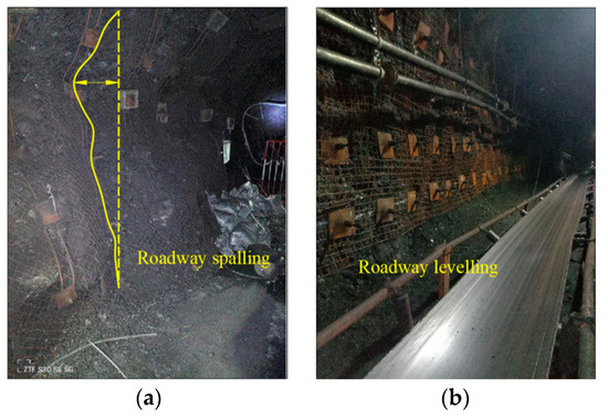 Due to the large burial depth of the working face, high in situ stress, and the strong dynamic load disturbance in the overlying strata, the surrounding rock of the 40307-belt transport roadway often exhibits a rib spalling, floor heave, and anchor cable breakage during excavation and mining, which seriously affects the safe and efficient production of the mine. The deformation and failure of the roadway are shown in Figure 3.