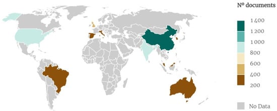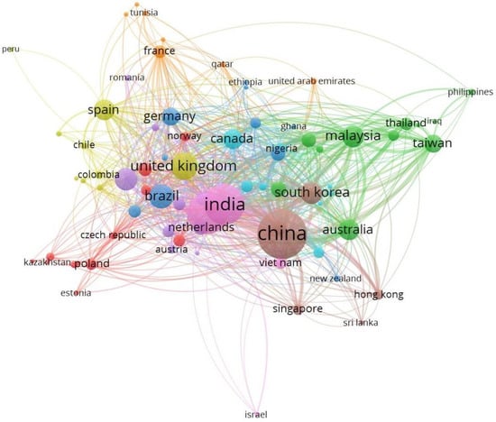 In order to identify existing worldwide collaborations on “bioenergy from waste” between authors, Vosviewer® software version 1.6.18 was used. The size of the circle shows the importance of the country based on the number of publications, and the lines represent the collaboration in scientific documents between the different countries. Figure 2 and Table 1 show the existing scientific collaborations between the main countries involved in research on bioenergy production from waste.