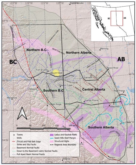 - Edwards, D.E.; Barclay, J.E.; Gibson, D.W.; Kvill, G.E.; Halton, E. Triassic strata of the Western Canada Sedimentary Basin. In Geological Atlas of the Western Canada Sedimentary Basin; Mossop, G.D., Shetsen, I., Eds.; Canadian Society of Petroleum Geologists and the Alberta Research Council: Calgary, AB, Canada, 1994; pp. 259–275. [Google Scholar]