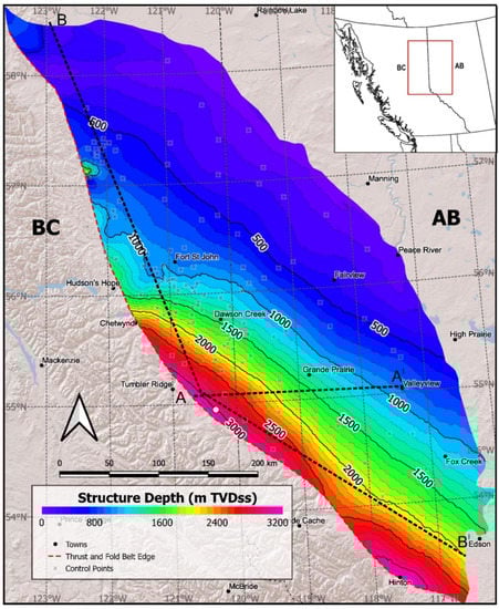 The Montney Formation structure and isochore data were mapped (Figure 2, Figure 3, Figure 4, Figure 5 and Figure 6) using the stratigraphic picks of [31]. The subcrop area of the Montney Formation to the northwest of the fold and thrust belt forms an elongated belt extending over a maximum of 250 km and dipping to the southwest (Figure 2). The top and base structures of the Montney Formation are sub-parallel and follow the general southwesterly dip trend of the Phanerozoic in the basin (Figure 2). The present-day subsea depths to the top of the Montney Formation range from 200 m in the northeastern part of the subcrop, near the border between British Columbia and Alberta, to 3200 m along the southwestern limit of the deformation front (Figure 2). The structure on top of the Montney Formation is significantly shallower to the northwest of the Fort St. John Graben, where it forms a plateau immediately west of Fort St. John and does not exceed 1500 m of subsea elevation.