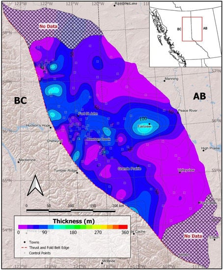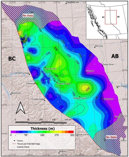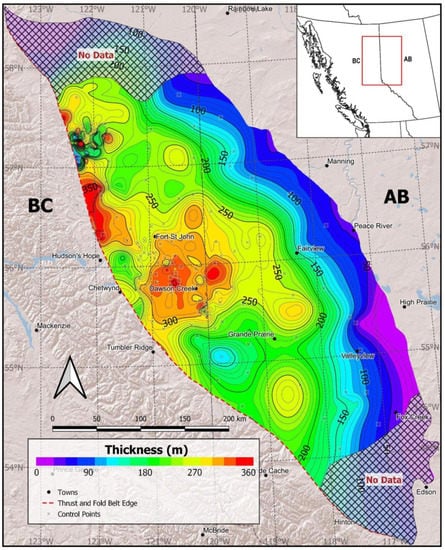 The isochore thickness of the Montney Formation generally increases towards the deformation front (Figure 3). However, there is an increase in the thickness south of the Fort St. John area due to the active subsidence of the Fort St. John Graben structure. Thickness remains consistent in most parts of the basin with the exception of the areas north of latitude 57° and west of longitude 122°, which may be due to large-scale structural features related to the Laurier Embayment ([32]; Figure 1, this study).