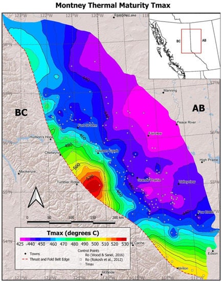 The thermal maturity indicator, Tmax [35], was mapped for the Montney Formation. Tmax values were obtained from the public domain and reviewed for consistency within each well and for regional agreement. Data outside of the reasonable range expected for Tmax between 400 to 550 °C was discarded. South of Dawson Creek, in the overmature area, Tmax measurements are unreliable, and converted vitrinite reflectance data from [2] were used instead. In the south corner of the subcrop area, around Hinton, data are sparse and the map vitrinite reflectance data published by the Alberta Energy Regulator [36] was used as a guide. A vitrinite reflectance to Tmax correlation based on [37] was used.