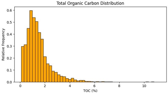The total organic carbon (TOC) content in the Montney Formation ranges from 0.1 to 12%, with a 10th percentile of 0.4%, a median of 1.2%, and a 90th percentile of 2.7% (Figure 8). The geographic distribution of TOC content suggests higher organic richness adjacent to the deformation front (Figure 9) which coincides with a higher gamma ray and higher resistivity, particularly where the Upper Montney Formation is thicker (Figure 4). The higher TOC content in the western edge of the basin may be due to deeper marine water with anoxic bottom water (i.e., 200 to 400 m deep; [52]) that preserved the organic matter compared to more shallow marine conditions in the east in Alberta. Along the eastern edge, particularly in the southeast, there are areas of relatively higher TOC content, which are likely due to the low thermal maturity in these regions, and consequently lower kerogen transformation ratios or a difference in the depositional environment such as a decrease in oxygen content in the water column in localised deeper water settings. The geographic distribution of TOC content, however, is based on point data from sample analysis (i.e., TPH/TOC source rock analyser—SRA™) and therefore may be biased according to more heavily sampled locations and stratigraphic intervals.