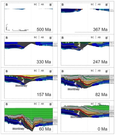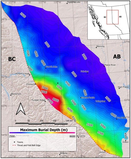 A reconstruction of the burial and thermal history of the Montney Formation was conducted through basin modeling using the Schlumberger PetroMod software. Publicly available regional heat flow data [38,39] were used to map present-day heat flow. The post-Laramide heat flow distribution (60 Ma) was calculated as 90% of the present-day heat flow, based on estimates by [40]. A constant heat flow of 55 mW/m2 was assumed for the Cambrian, based on an average for the North American continent [41].
