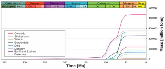 In the third phase, after an uplift during the Pennsylvanian, sedimentation resumed from the Permian through most of the Early Cretaceous at a steady but relatively low rates of between 3 and 6 m/Ma. A few erosional unconformities with generally less than 200 m of missing section and hiatuses occur throughout this period across the entire region, but with very little impact to depth of burial. During this time, significant localized variations in relative subsidence rates occurred. With the collapse of the Peace River Arch and the Dawson Creek Graben Complex faults reactivation in the Triassic [6,20,54,55,56], the Peace River Embayment became the depocentre, with the net subsidence rates in the western central part of the basin being twice as high as towards the northern, southern, and eastern edges. In the Peace River Embayment depocenter, subsidence rates during the Triassic are as high as 15 m/Ma.