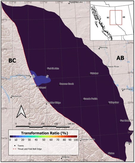 Kerogen transformation ratio in the Middle Montney Formation at 60 Ma. With continued rapid foreland subsidence, areas along the deformation were at 100% transformation ratios, and secondary cracking of wetter hydrocarbons to dry gas (SHCs) started in the deepest areas.