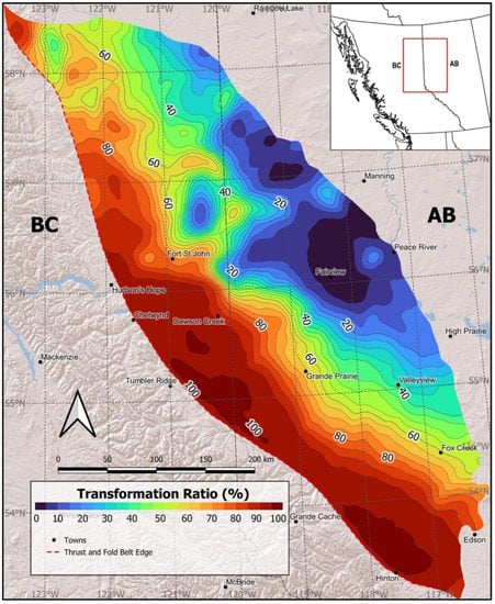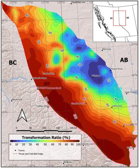 The total organic carbon content of the Montney Formation increases towards the deformation front (Figure 9), as this area was further offshore, wherein both the generation and preservation of organic matter tend to be higher. The nearshore environments also received greater volumes of clastic material that could dilute the TOC contents, which has been identified in the Cretaceous sediments of the WCSB (i.e., [58]). The hydrogen index (HI, Figure 11) for the Montney Formation correlates with the maturation trends with decreasing HI content in the remaining kerogen towards the deformation front; this trend also correlates with the transformation ratios from the basin models, indicating a greater portion of the kerogen is transformed into hydrocarbon in the deeper parts of the basin that experienced greater temperatures over longer time periods than the eastern portion of the basin.