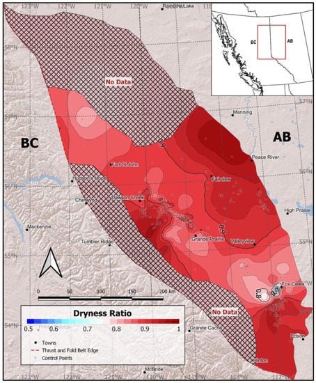 The distribution of the gas dryness ratio for the Lower Montney Formation. A similar gas dryness pattern was observed from individually mapping the Upper and Middle Montney Formation subzones.