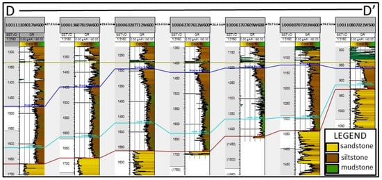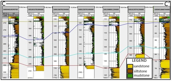 NE-SW cross-section along the depositional dip near the Dawson Creek area. See Figure 24 for the location of the cross-section C–C′. The Upper Montney Top is the brownish yellow line, the Middle Montney Top is the dark blue line, the Lower Montney Top is light bluish green line, and the base of the Montney at the Belloy Top is the dark red line. The Upper Montney subunit becomes thinner, and the overall gamma ray values for the Montney formation decrease towards the NE into Alberta.