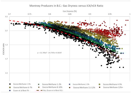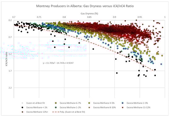 Cross plot of gas dryness and the iC4/nC4 ratio for all Alberta Montney producers at the time of this study. The iC4/nC4 is used as a maturity indicator with the line best representing the regional maturation trend from [4]. An excess methane percentage was calculated from the deviation away from the expected gas composition of the regional maturation trend. Wells that have high excess methane (i.e., red colours) have a greater ex situ gas content compared to wells noted by black symbols. Wells represented by black or green symbols have low ex situ gas contents, and the hydrocarbons are the result of in situ generation that is typical of a self-sourcing reservoir. The Alberta Montney producers have a greater contribution of migrated gas than the BC wells.