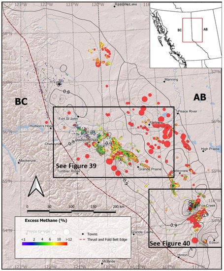 Gas composition of the produced or tested hydrocarbons are performed at commercial laboratories and use gas chromatographic methods (i.e., [34]). Gas dryness is calculated from the ratio of methane to the sum of methane (C1), ethane (C2), propane (C3), butane (C4) and pentane (C5). Only C2 to C5 wet gases are used in the measurements as longer chained hydrocarbons (LHCs) are not routinely measured in each well. This study has also utilised cross-plots of iC4/nC4 isomer ratio of butane versus the gas dryness for BC and Alberta. Gas dryness is the ratio between the methane fraction and the sum of all hydrocarbons for each sampled well. The regional maturation polynomial regression line from [4] was used to determine the gas dryness percentage for each well based on its maturation level determined by the butane isomer ratio. The deviation from the calculated gas dryness based on the regression was determined as an excess methane percentage and subdivided into nine categories of excess methane (< 1%; 1–2%; 2–3%; 4–5%; 6–7%; 8–10%; 11–12%; and 12%+).