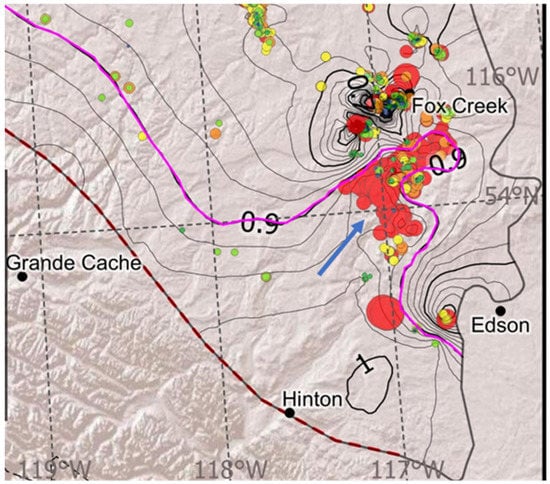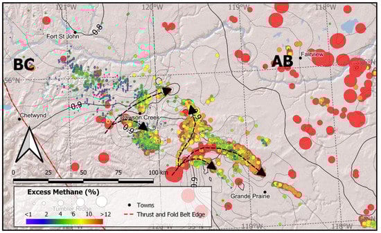 The trends in gas dryness and excess methane percentage distributions also highlight changes from regional trends in the Fox Creek area in southern Alberta (Figure 24, Figure 38, and Figure 40). This area is complex with a very wet Upper Montney subunit in an area west of Fox Creek (Figure 27) and also dry gas migration from deeper areas migrating east into the area south of Fox Creek (Figure 24 and Figure 40). The pink line highlights the drier gas composition contour of 0.9 (i.e., 90% methane composition in producing fluids). The wetter gas compositions north of Fox Creek does reflect the lower Tmax values shown in Figure 7 as the maturation pattern changes in this area with more of a north–south trend in maturation and not the WCSB-scale, regional trend of SW-NE. The thickness of the Montney Formation is most likely to be affected by the Fox Creek escarpment, and the thickness is greater in the northern sections (Figure 32), which correlates with the higher TOC and HI content (Figure 9 and Figure 11, respectively) and the lower gas dryness composition. The kerogen type may be responsible for the change in gas composition in this area, with more type I and II kerogen generating longer chained hydrocarbons. When comparing the excess methane percentage for the Fox Creek region (Figure 40), the blue arrow indicates a migration of drier gas into the Fox Creek area, as illustrated by the high concentration of large red bubble plots compared to the area north of the town of Fox Creek that contains smaller bubble plots in a variety of shades of green, blue, yellow, and orange. Even though the area south of Fox Creek is more mature than the area to the north of Fox Creek, the excess methane percentage indicates that the hydrocarbon composition in much drier than what is expected at the maturation level and therefore indicates that SHCs have migrated, probably from more mature areas in the south near the town of Hinton (Figure 7, Figure 24, Figure 25, Figure 26 and Figure 27).