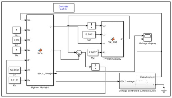 After acquiring the parameters, these parameters were used as inputs to the designed Python/MATLAB/Simulink (PMS)-hybrid model [7]. The Python/MATLAB/Simulink (PMS)-hybrid model in Figure 1 was used to simulate the EDLC.