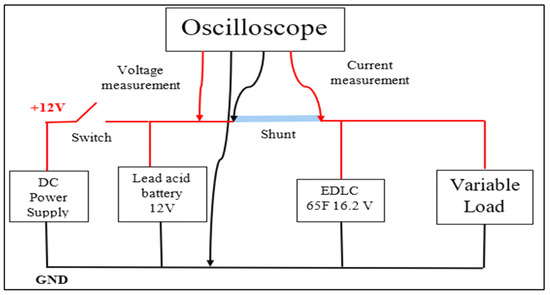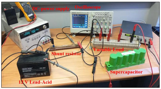 Figure 3 shows the components in the experimental HESS circuit connected in the actual laboratory experiment. The 0–20 V variable DC-power supply, the 65 F, 16.2 V, EATON model EDLC, the RS-PRO 12 V Sealed lead-acid battery (7 Ah), a 20 A, 200 mV shunt resistor, a four-channel 20 MHz Tektronix oscilloscope and the 5.2 Ω, 20 W variable load can be clearly seen in the circuit below.