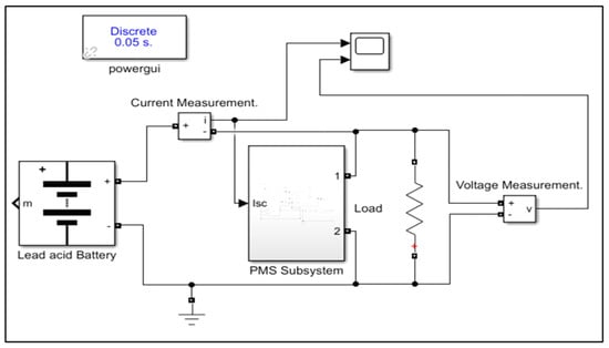 The HESS simulation model was designed with the PMS-hybrid model of the EDLC as a sub-component in the MATLAB/Simulink HESS model. To use the PMS-hybrid model as a sub-component in the MATLAB/Simulink HESS model, one input and one output of the PMS-hybrid model of the EDLC must be considered. The input to the PMS model of the EDLC is the node which supplies the current. The output of the PMS model of the EDLC is the node which generates the voltage, as shown in Figure 1. In the HESS simulation model in Figure 4 the node is connected to the node in the PMS sub-component, and the “1” node is connected to node in the PMS sub-component. The simulation setup, shown in Figure 4, consists of the designed EDLC PMS-hybrid model encapsulated as a subsystem, an in-built Simulink lead-acid battery, a Simulink resistive load, a Simulink scope for data capturing, a Simulink current measuring meter, connected in series with the battery, as was performed in the experimental setup, and a Simulink voltage measuring device in parallel with the load. The lead-acid battery and the EDLC had built-in voltages.