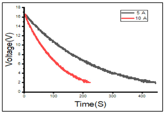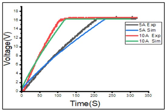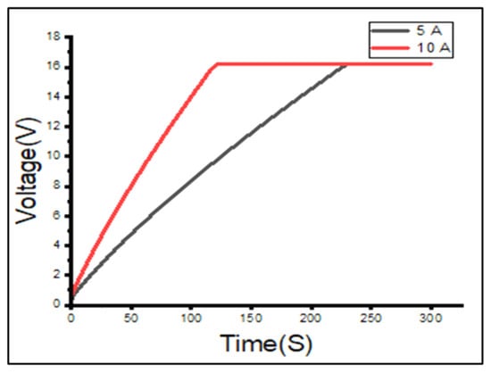 The EDLC’s experimental charge profiles obtained at a constant current of 5 and 10 A were superimposed on each other, as can be seen in the graph in Figure 5. It can be clearly seen that the charge profile for 10 A has a much higher gradient than the charge profile for 5 A, resulting in the 16.2 V EDLC reaching its maximum voltage of 16.2 V within a shorter time at 10 A. This result is consistent with the theory of charging the EDLC at a higher current.