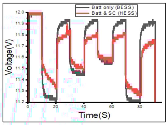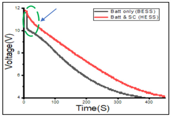 The battery voltage values measured experimentally for both the BESS and HESS configurations can be seen in Figure 11. The BESS graph shows a sudden drop in voltage, while the HESS curve shows a more stable drop in voltage. The variation between the curves in the BESS and HESS configurations is highlighted by the green circle with short dashes. In the HESS system, the voltage drop is reduced by 17%. The reduction in voltage occurs due to the load connection which draws current from the battery. In the BESS configuration, the load draws a larger current from the battery; as a result, there is a larger drop in voltage. In the HESS configuration, the load draws a smaller current from the battery since the supercapacitor supplies some of the current, and the impedance from the battery looking in the direction of the load, is higher due to the presence of the supercapacitor. Hence, the battery voltage in an HESS configuration varies less than that in a BESS configuration and is more stable. This applies less stress on the battery and can improve its lifespan.