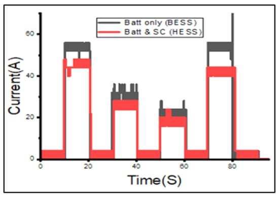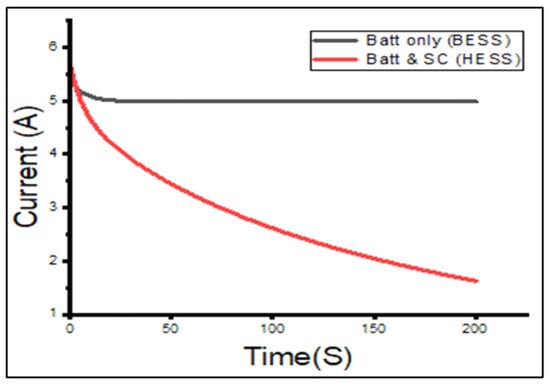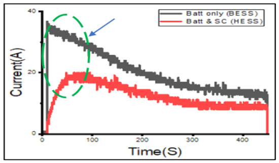 The battery current values measured experimentally for both the BESS and HESS configurations can be seen in Figure 12. The green circle with short dashes shows the variation between the battery current in the BESS and HESS configurations. The sudden spike in current experienced by the battery in the BESS configuration went up to a peak of approximately 37 A. This increase in current was very sudden. In the HESS configuration the increase in battery current is less sudden, more controlled and reaches a peak of about 19 A. The battery peak current drawn by the load in the HESS configuration is approximately 48.6% lower than that in the BESS configuration at the onset. The current drawn in HESS does not spike and is more controlled and stable due to the presence of the EDLC. This puts less stress on the battery and can prolong its lifespan.