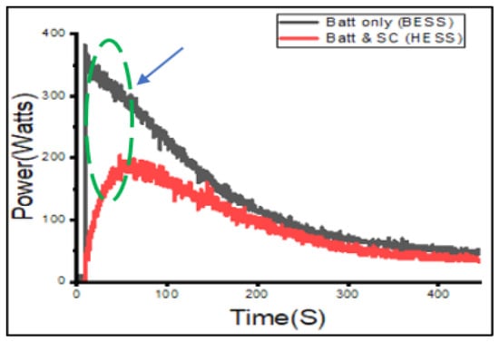 The battery power results obtained experimentally for both the BESS and HESS configurations can be seen in Figure 13. The power drawn from the battery in the BESS configuration is higher than that drawn in the HESS configuration. In the HESS setup, the power drawn at the onset is reduced by 48.6%. The power drawn in the BESS setup exhibits a sharp spike. In the HESS setup, the power drawn is more stable and controlled. The power drawn in the BESS setup has a larger variation than that in the HESS setup. This means that the battery in the HESS setup will experience less stress and improve battery life. Additionally, the sudden surge of power in a BESS setup can potentially damage a load, whereas, in the HESS setup with the supercapacitor present, the load is partially protected.