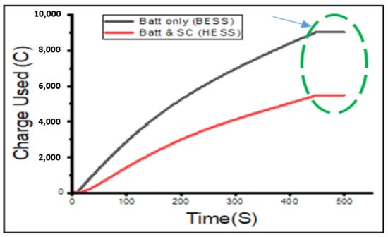 The charge utilization curves derived experimentally for both the BESS and HESS configurations can be seen in Figure 14 below. In the HESS configuration, the amount of charge used from the battery during the discharge process is less than that of the BESS configuration. The difference is indicated by the green circle with short dashes. The charge utilized in the HESS setup by the battery after 8 min is 44% less than that in the BESS. This indicates that the battery would last longer for a single discharge cycle in the HESS setup. The charge utilization curve in the BESS setup has a larger gradient as compared to the HESS curve. Figure 14 shows that the cumulative battery charge used at the time 500 s of the experiment is less in the HESS setup than it is in the BESS setup. The area under the curve gives the total charge of the battery.