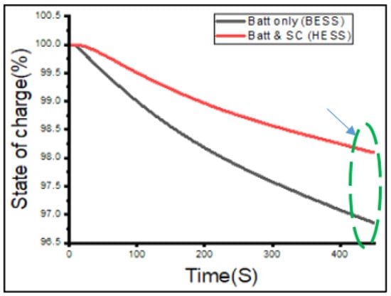 The SOC results calculated from the experiment for both the BESS and HESS configurations can be seen in Figure 15. The battery SOC percentile in the BESS setup decreased within a shorter time and at a higher gradient than that in the HESS setup. At a runtime of 500 s, the battery SOC in the HESS setup was 98.25%, and the battery SOC in the BESS setup was 96.75%. This indicates that there is more charge left in the battery in the HESS than in the BESS at the same time.
