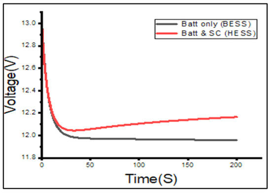 The simulation results obtained with the PMS-hybrid EDLC model in MATLAB/Simulink (HESS) and without the PMS-hybrid EDLC model in MATLAB/Simulink (BESS) are given in this section. The simulated voltage values can be seen in Figure 16. The figure shows that, in the BESS setup, the battery voltage drops more significantly than in the HESS setup. This proves that less stress is exerted on the battery due to the presence of the EDLC in the HESS. The trends of the voltage values in the simulated setup follow a similar pattern as those in the experimental setup, validating the simulation model.