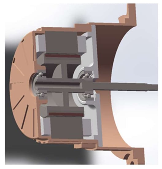 The prototype is a fractional-slot surface-mount PM motor with a housing made of magnesium-aluminum alloy. The PM motor has a rated power of 200 W, a rated speed of 2500 rpm, and a rated output torque of 0.76 Nm. The overall mechanical structure of the PM motor is shown in Figure 1, and its main parameters are shown in Table 1.