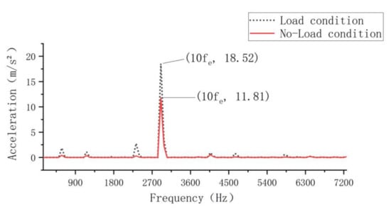 Figure 2 shows a schematic diagram of the vibration acceleration on the surface of the permanent magnet motor housing. A model with a load of 0.76 Nm was built based on the parameters of the PM motor, and the PM motor was operated under the rated operating conditions. Then, the nonlinear vibration was analyzed and calculated to obtain the vibration acceleration simulations for the PM motor. Figure 2 shows that the vibration acceleration of the motor at 10fe frequency was much higher than other frequencies, regardless of load, which is the largest source of vibration noise. The most sensitive frequency range of the human ear is about 1 kHz~8 kHz; the 10fe of the PM motor was exactly 2910 Hz, which is within this range.