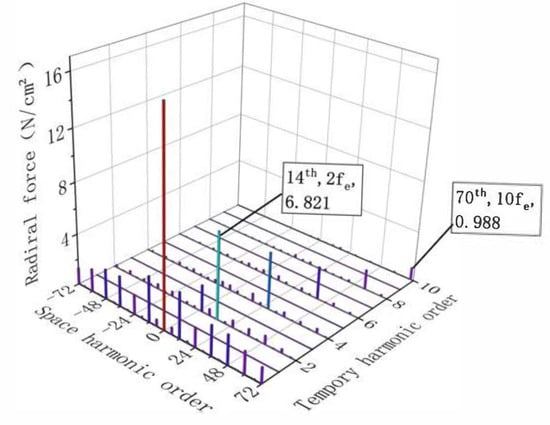 By further extending Formula (3), the source of electromagnetic force can be divided into three parts: the self-interaction of the permanent magnetic field, the self-interaction of the armature magnetic field, and the interaction between the armature magnetic field and the permanent magnetic field. These three electromagnetic force harmonics were extracted to obtain the Table 2: