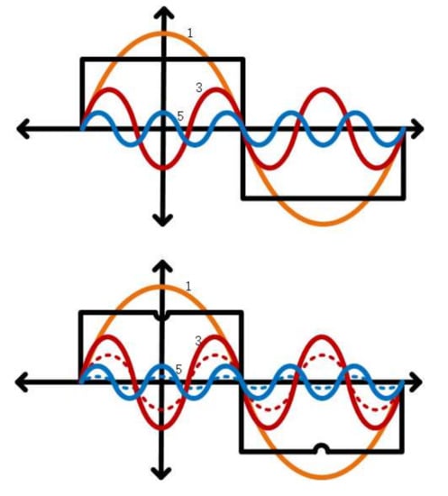 In the above formula, μr is the relative recovery permeability, μ0 is the vacuum permeability, B is the remanence of the permanent magnet, and αp is the polar arc coefficient. Obviously, the amplitude of the MMF is proportional to the magnetization length. As shown in Figure 8, after slotting, the amplitude of the MMF at the slotting will decrease, thus affecting the distribution of harmonics of all orders. In Figure 8, the orange, red, and blue lines represent the first harmonic, third harmonic, and fifth harmonic, respectively, and the numbers represent their harmonic orders. The dotted line represents the decrease in harmonics of different orders after slotting.