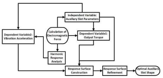 The main process of the optimization simulation is shown in Figure 10. In order to obtain better optimization results, an optimization algorithm can be used []. The width and position of the auxiliary slot were extracted as independent variables. The vibration acceleration and output torque of the permanent magnet motor were used as optimization target parameters. All the above parameters were added to the response surface parameter construction and optimized by the response surface.