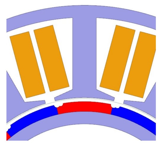 Currently, there are many methods to reduce the vibration noise of permanent magnet motors by reducing the low-order electromagnetic forces [,,,,]. In the literature [,], slotting on the stator was proposed to reduce noise. The slots changed the distribution of the air-gap magnetic field to reduce the low-order electromagnetic forces. Although higher-order electromagnetic forces were not mentioned, this observation illustrated that noise can be optimized by modifying the magnetic structure of the motor. The authors of [] analyzed various methods to enhance the performance of motors through magnetic pole optimization and modification of magnetic steel; however, they did not mention any reduction in high-order electromagnetic force. A method was proposed in [] to improve voice coil motors, which are used in the nano-stage in lithographic equipment, by improving the part of the magnet or the back iron in the motor structure. The authors of [] proposed the use of slots on the surface of the rotor magnets to reduce the cogging torque but did not apply this method to study vibration and noise. The authors of [] showed that reducing the higher-order electromagnetic forces can greatly improve the electromagnetic noise of motors. Those authors also proposed a targeted step skewing of rotor segments to reduce the higher-order electromagnetic forces. However, it was shown that the machining of such a rotor is difficult, and that it leads to a decrease in power density. There are few methods to reduce the higher-order electromagnetic forces, most of which reduce the output performance of the motor. In view of the above research, we propose a new method which can not only reduce the vibration noise caused by the high-order electromagnetic force of the motor, but which also brings about no reduction in the output torque.