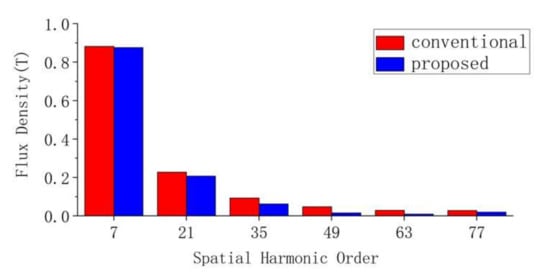Figure 3 shows the Fourier decomposition of the air gap flux density. It can be seen that the PM flux density is much higher than the armature flux density, and as such, that the former is the main source of the electromagnetic force. It also can be seen that the interaction between the 7th and 77th order, 7th and 63rd order, 21st and 49th order, and 35th order flux density of the motor is the main cause of the 70th order electromagnetic force at 10 times the frequency. Therefore, in order to achieve a good noise reduction effect, it is necessary to reduce these harmonic components substantially while also ensuring that the fundamental components are not reduced.
