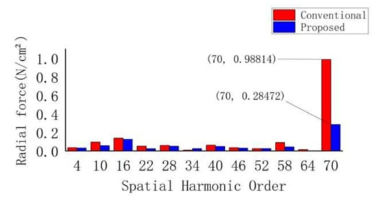 Figure 14 shows a harmonic comparison of the electromagnetic force of each order at 10fe with slotting on the surface of the permanent magnet. As shown, the 70th order electromagnetic force was reduced by 69%, which is in line with the analysis in Section 2.1, in the sense that the radial electromagnetic force mainly comes from the magnetic flux density of the motor permanent magnet.