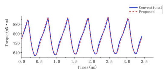 Figure 15 shows that the vibration acceleration decreased substantially at the 10fe frequency. This result verifies the correctness of the analysis in Section 2.2, i.e., the higher-order electromagnetic force was modulated into a lower-order vibration response, resulting in modulated vibration. Therefore, weakening the higher-order electromagnetic force wave can reduce the vibration noise. As shown in Figure 16, the output torque of the motor did not decrease. The advantage of this method is that the noise is greatly reduced while the output torque is guaranteed. In addition, this result also verified our theoretical analysis.
