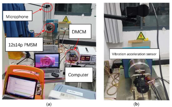 Experimental platform. (a) The arrangement of the experimental equipment. (b) The position of the vibration acceleration sensor. Figure 19 shows a comparison of the vibration acceleration on the surface of the motor housing in the finite element simulation and the actual test. In the simulation, the motor torque was exactly the same as the actual test torque. On this basis, the appropriate damping coefficient was set. In this case, the simulation results agreed with the actual test results, which verified the accuracy of the simulation and ensured the accuracy of the optimization method proposed in this paper.