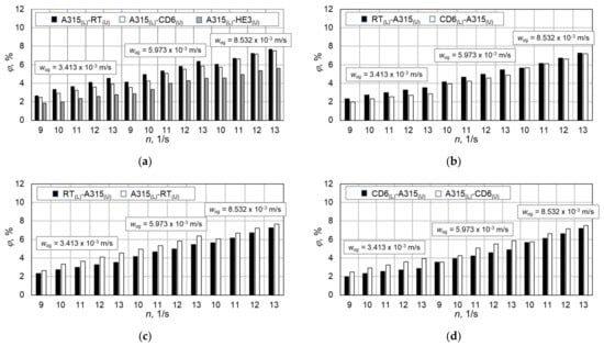 Dependence of φ = f(n) for different configurations of impeller; standard planer baffles, c = 2.5% mass. (a) the effect of the upper impeller type; (b) the effect of the lower impeller type; (c,d) the effect of replacement of two impellers on the shaft.