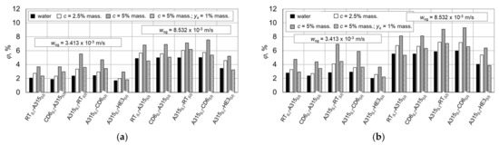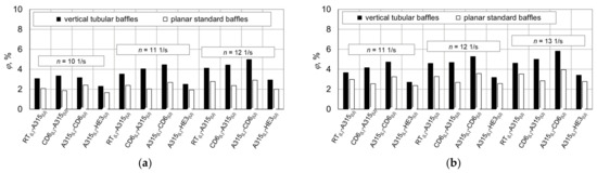 Dependence of φ = f(configurations of impeller); standard planer baffles, (a) wog = 5.973 × 10−3 m/s; (b) wog = 8.532 × 10−3 m/s.