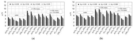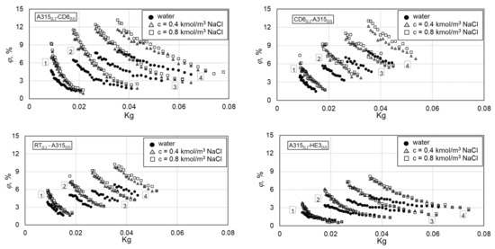 Assuming a constant value of gas flow number Kg, the value of gas hold-up with increasing sucrose concentration in the system increases on average by about 70% for wog = 5.973 × 10−3 m/s (Figure 5a) and about 50% for wog = 8.532 × 10−3 m/s (Figure 5b). On the other hand, adding yeast to the system caused a decrease in the amount of gas hold-up by about 25% regardless of the value of the superficial gas velocity in the vessel. In most cases, the highest values of gas hold-up, regardless of the type of system, were obtained for the configuration of the A315(L)-RT(U) impeller.