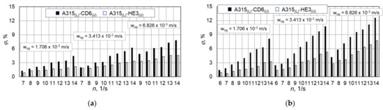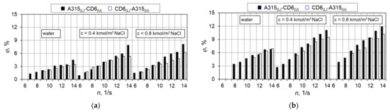 The measured values of φ for the vessel with vertical tubular baffles and configuration of two impellers A315(L)-CD6(U) and CD6(L)-A315(U) for two different superficial gas velocity wog = const = 1.706 × 10−3 m/s and 5.119 × 10−3 m/s are compared in Figure 9. Analyzing the values of φ obtained for three liquid–gas systems (air-distilled water and air–aqueous solution of NaCl of concentration c = 0.4 kmol/m3 and 0.8 kmol/m3) and two impellers configuration, it was found that, for the constant superficial gas velocity wog = const = 1.706 × 10−3 m/s and 5.119 × 10−3 m/s, gas hold-up φ increases with an increase in the speed impeller n. Placing the A315 impeller in the lower position of the A315(L)-CD6(U) impeller configuration and the CD6 in the upper impeller position increases the operating range of this system. In this geometry, good gas dispersion starts at lower values of n compared to the CD6(L)-A315(U) impeller. It was observed in Figure 9a that, when using the A315(L)-CD6(U) impeller configuration and wog = 1.706 × 10−3 m/s for the three gas–liquid systems, the φ values are on average higher by about 18%. Only in a few cases, for the speed impeller n = 7 1/s and 8 1/s and the superficial gas velocity wog = const = 1.706 × 10−3 m/s and the air–aqueous solution of NaCl of concentration c = 0.4 kmol/m3, as shown in Figure 9a, the values of φ are, respectively, 12% and 22% higher when the CD6(L)-A315(U) configuration was used. Analyzing the data of φ values presented in Figure 9b for three different liquid–gas systems and the value of the superficial gas velocity wog = 5.119 × 10−3 m/s, higher values of φ were obtained for the A315(L)-CD6(U) impeller configuration. Only when the superficial gas velocity is wog = 5.119 × 10−3 m/s and the speed impeller n is equal to 12 1/s and 14 1/s, the values of φ for the gas-distilled water system and for the impeller configuration CD6(L)-A315(U) are slightly higher (on average by about 2%).