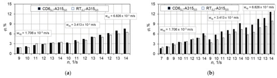 The influence of the type of lower impeller on the φ value was analyzed using the CD6(L)-A315(U) and RT(L)-A315(U) system impeller, where the Smith turbine (CD6) or Rushton turbine (RT) was used as the lower impeller. The dependence values φ = f(n) for two different impeller configurations CD6(L)-A315 (U) or RT(L)-A315(U) and for two different gas–liquid systems (air–water system, air–aqueous solution NaCl of concentration c = 0.8 kmol/m3) were presented in Figure 7. Comparing the φ values obtained for configuration of the CD6(L)-A315(U) impeller with the φ values obtained for configuration of the RT(L)-A315(U) for n = 13 1/s, the results were comparable at wog = 1.706 × 10−3 m/s, wog = 3.413 × 10−3 m/s and slightly, by about 15%, higher at wog = 6.826 × 10−3 m/s φ value for the air–water system. For the system air–aqueous solution NaCl of concentration c = 0.8 kmol/m3 for the constant superficial gas velocity wog = 1.706 × 10−3 m/s higher by about 11%, 18%, and 13%, the value of φ was obtained for the impeller speed n of n = 8 1/s, 9 1/s and 14 1/s, respectively, and the configuration of the CD6(L)-A315(U) impeller. For the increased superficial gas velocity wog = 3.413 × 10−3 m/s, wog = 6.826 × 10−3 m/s, respectively, higher values of φ by an average of about 26% for the analyzed range of impeller speed 9 1/s–14 1/s and about 32% for the range of impeller speed 10 1/s–14 1/s were obtained for the configuration of the CD6(L)-A315(U) impeller.