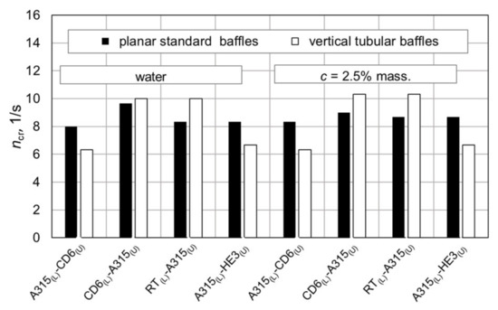 The obtained critical impellers speed, at which it was assumed that the system has good mixing and phase dispersion, depend not only on the configuration of the impellers but also on the type of baffles in the vessel (Figure 10). In the case when the vessel was fitted with vertical tubular baffles, lower (by about 30%) values of the critical impeller speed were obtained for the impellers configuration in which the A315 impeller was mounted on the bottom shaft. The location of the A315 impeller in the upper position resulted in lower critical values of the impeller speed (by about 15–20%) in the case when planar standard baffles were installed in the vessel.