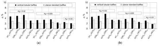In all the analyzed cases, assuming constant values of superficial gas velocity wog and impeller speed n, it was found that significantly (even twice) higher values of gas hold-up were obtained for the vessel with vertical tubular baffles (Figure 11). The influence of the baffles on gas hold-up depends on the type of configuration of the impellers and the type of liquid in the system. Comparing the results obtained in the vessel with vertical tubular baffles to the tank with planar standard baffles, it was found that the greatest effect on the values of gas hold-up was obtained for the configuration of the CD6(L)-A315(U) impellers. For this configuration of impellers for the vessel with vertical tubular baffles, the results for the water–air system were up to two times higher and, for the 2.5% aqueous sucrose-air system, about 70% higher compared to the vessel with planar standard baffles. The influence of the type of baffles on gas hold-up, for all the analyzed impellers configurations, decreased when sucrose was added to the vessel. On the other hand, when comparing the results obtained for the tested vessel–impeller configuration–baffle systems, it was found that, assuming a constant value of gas flow number Kg, the effect of baffles type decreases not only with an increase in the sucrose concentration in the system but also with an increase in the gas flow number Kg (Figure 12).