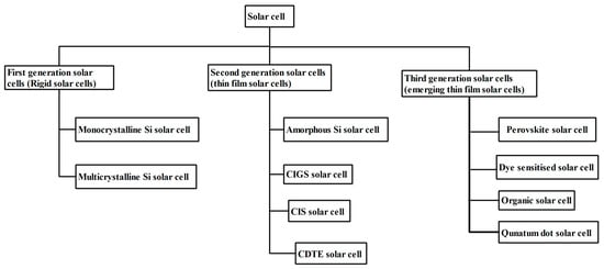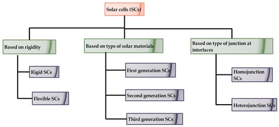 As shown in Figure 1, SCs are typically classified by the rigidity of the solar material, i.e., rigid and flexible SCs. At an earlier stage, SCs were developed over rigid substrates, which has several disadvantages such as being somewhat heavier in weight, being difficult to install over any curvatures, and having a higher production cost []. However, rigid Silicon (Si) based SCs possess excellent stability, whilst. flexible thin film SCs are lesser in weight, can be installed over convenient curvatures, can be folded or rolled easily and fabrication cost is less. Stability is a major concern in flexible SCs. Based on the photo-active materials used at various stages, they are classified into first, second and third generation SCs. SCs are also categorized into homojunction and heterojunction SCs depending upon the number of materials that make up the photo-active layer []. Among all SCs, bulk heterojunction hybrid tandem SCs show the maximum PCE. Tandem SCs were developed for overcoming the drawbacks occurring in single material SCs such as the utilization of excess energy of incident light and easier transmission of low energy photons, without participation in the energy conversion process. Some of the commonly observed tandem architectures are two-terminal, mechanically ordered four-terminal and optically coupling four-terminal. With the help of a two-terminal tandem configuration, easier integration with the PV module was achieved than in single junction SCs. In mechanically ordered -terminal SCs, the sub-cells work with their own terminals leading to the non-requirement of the current-matching phenomenon []. Meanwhile, optically coupled tandem architecture was not integrated physically, but the sub-cells were coupled through an optical splitter positioned in an appropriate manner. Integration of sub-cells was more flexible with optically coupled tandem architecture, but costlier due to the inclusion of spectral filters []. In addition to capability in absorbing light which occurs at lower and higher wavelengths, the performance of tandem SCs can further improve through doping of impurities []. Because of the addition of impurities, there is a possibility of tuning the energy band gap of the photo-active layer []. As rigid SCs have been significantly engineered and have captured the entire solar market, we directly review thin film SCs and emerging thin film SCs from various perspectives. Figure 2 depicts the many generations of SCs as a flowchart.