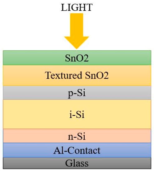 Due to the disordered nature of the materials, some atoms have dangling bonds. These dangling bonds are considered as defects in the structure of a-Si. The material can be passivated by the hydrogen atoms which bond with the dangling bonds and hence reduces their density. Hydrogenated a-Si (a-Si:H) possess sufficiently less defects and were mostly used in the field of PVs. a-Si:H was initially fabricated in the year 1969 by Chittick, Alexander and Sterling []. The major benefits of hydrogenation of a-Si are much easier fabrication and a much shorter energy payback period. However, hydrogenation leads to the material’s light-induced degradation due to the Steabler-Wronski effect. Hydrogenation also facilitates the possibility of doping in the a-Si:H SC. Furthermore, adding carbon atoms to the a-Si:H might improve the cell’s electrical properties. This addition will lead to the improved transparency of the cell, which results in intensified light trapping and enhanced PCE []. The addition of carbon might also widen the band gap of a-Si:H. The increasing carbon content influences electron mobility, resulting in enhanced disorder in the elemental arrangement. More light can be transmitted into the depletion region of a-Si:H through utilizing TiO2 nanosphere electrodes which were further coated with ITO in front contact [].