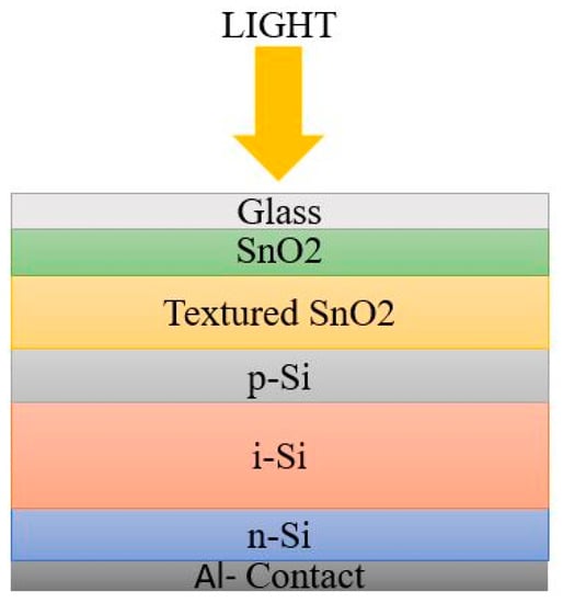 The p-n junction is not enough for efficient charge carrier collection because of the restricted hole mobility, to a certain extent, and of the higher defect density. Hence, an intrinsic absorber layer was introduced between the p- and n- region for charge carrier mobility. The order of arrangement of a-Si:H cell architecture may start with n-type or p-type material. Based on the deposition sequence, there are two possible architectures for a-Si:H cell: superstrate or PiN configuration, and Substrate or NIP configuration [,].The schematic diagrams in Figure 3 and Figure 4 represent the simple architecture of a-Si SC in superstrate and substrate configuration.