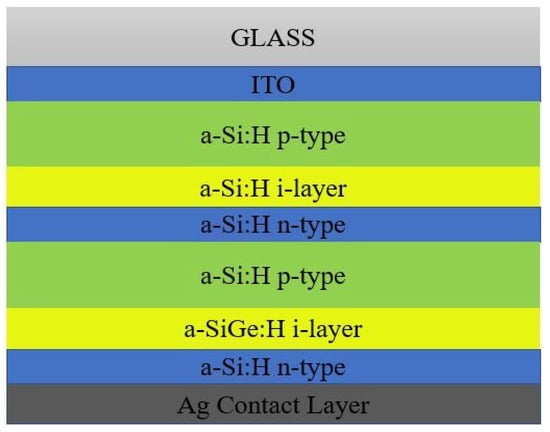 For effective exciton generation and hole collection, the cell is designed in such a way that the light incidence occurs initially only with the p-type material. Typically, the a-Si:H cell architecture consists of TCO, p-type a-Si:H, an intrinsic a-Si:H absorber layer, n- type a-Si:H and metal contact []. In order to obtain better electrical contact for SC, TCO must be the front contact while the back contact may be either conductive metal or TCO. The open circuit voltage was enhanced by a wider bandgap for the active intrinsic absorber layer []. Some foreign elements such as oxygen, carbon, etc., when reinforced with the a-Si:H might also widen the bandgap. The superstrate and substrate were also differentiated by means of transmissivity behavior. The superstrate configuration is most probably temperature resistant and transparent in nature, hence all PIN configurations were preferred for the fabrication of solar modules [], but the substrate configuration is opaque in nature and preferred for flexible SCs. There are various thin film-based silicon materials such as nanocrystalline silicon, proto-crystalline silicon and polymorphous silicon. The nanocrystalline silicon (µc-Si:H) has a narrow bandgap material as compared to wider band gap a-Si:H material. Here, the crystallite size varies from a few micro- to nano-meters. The continual nucleation phase of µc-Si:H possesses an undeveloped crystallite structure, known as proto-crystalline silicon (pc-Si:H) []. These are formed by the hydrogen dilution of SiH4, which is much closer to the interfacial phase of a-Si:H to µc-Si:H. Some of the major advantages of pc-Si:H are wider bandgap material and less density. Soon after, the attainment of critical thickness layers always seemed to consist of a microcrystalline structure []. If the silicon is grown in the plasma phase in the intermediate structural appearance, between the a-Si:H and µc-Si:H, then it is known as polymorphous silicon (pm-Si:H) []. During the deposition process, pm-Si:H was deposited over the entire layer depth with uniform homogeneity. Among all other silicon based structures, light induced degradation gives a faster rate for pm-Si:H. Defects of a-Si:H are band-tail state defects and mid-gap defect states []. Doping of foreign elements into the a-Si:H absorber layer might result in a change of fermi level. The heterojunction architecture might also utilize the fraction of unabsorbed incident light, in addition to the absorbed light, for the betterment of PCE in a-Si:H based SC. In a single junction SC, the chance of light absorption is at a particular wavelength, but in a multijunction SC, the cell has a capability to absorb light at varied energy levels []. Figure 5 represents the a-Si:H&a-SiGe:H heterojunction SC, which is capable of converting more photons into electrical energy.
