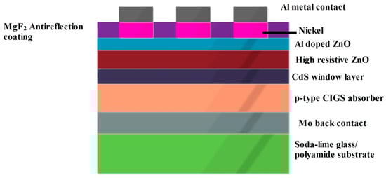 CIGS SCs can be used in place of conventional Si solar cells. In flexible CIGS SCs, which are a multilayered device, a crucial performance inhibitor was interfacial layers, which need to be selected based on stability against mechanical stress, resistance towards temperature and thermal expansion coefficient []. In general, Mo was used as back contact for flexible as well as rigid CIGS SCs. In the case of flexible solar cells, Mo with bigger grains are prone to exert internal minor cracks during plastic deformation of flexible SCs. The thickness of buffer layer CdS also plays a major role in performance of the solar cell. An increase in thickness of the CdS layer facilitates absorption of more photons of shorter wavelength. This leads to a smaller quantity photons reaching the depletion region and is also involved in the power conversion process. In addition to this, the charge carrier mobility of the CdS buffer layer was low compared to the CIGS absorber layer, which also degrades the current conversion efficiency of CIGS SC. Hence, the thickness of buffer layer CdS should be kept as low as possible for the attainment of elevated cell performance [].