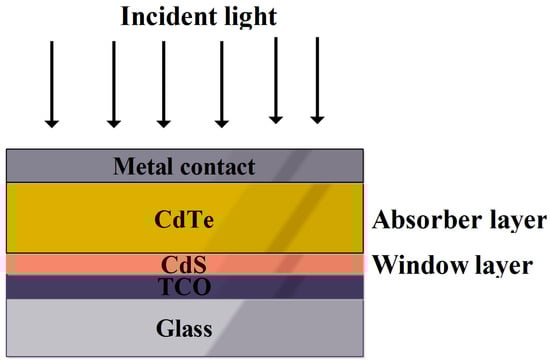 In CdTe SCs, conductive, stable and transparent natured TCO was preferred. However, using TCO as front contact of the cell architecture leads to the superstrate configuration as illustrated in Figure 7 []. The most commonly used materials as TCO were Al doped ZnO(ZnO:Al) and SnO2:In2O3(ITO) in CdTeSCs. The major advantage of these materials are much higher transparency and lower electrical resistance []. The main drawback of ZnO:Al as TCO is that they tend to breakdown easily at temperatures greater than 400 °C. The ITO at higher temperatures also makes the indium diffuse into the CdTe layer. However, the most suitable material at higher process temperatures greater than 500 °C is SnO2:F, which is commonly known as FTO. Other than these materials, the most suitable alternative, especially for CdTe, is Cd2SnO4 [].