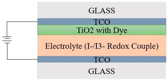 Dye sensitized solar cell (DSSC) is a SC which mimics the photosynthesis process of plants leading to generation of photoelectrons []. DSSCs generally comprise photo-electrolyte, TCO electrode, TiO2 electrode and encasing glass []. The electrolyte in DSSC should be stable, non-hazardous, solvent, with high ionic conductivity and better interaction with dye. Meanwhile, the counter electrode (metal or non-metal) should hold a higher surface area and high catalytic activity. Hence, platinum is the most commonly used counter electrode. Initially, light absorbed dye molecules become sensitized. The sensitized dye molecules in addition to the TiO2 molecules lead to electron generation and oxidation of the sensitized dye. The schematic diagram Figure 8 represents the simple DSSC architecture []. Operation of DSSC varies with conventional semiconductor based SCs as absorption of incident light and exciton generation do not occur cordially as in conventional cells. In this cell, the light is initially incident over the cell surface. Over the glass surface, the electrode TCO was coated, via which the generated electrons were transferred to another electrode by means of an external circuit []. From the NREL efficiency chart, it is evident that a maximum power conversion efficiency of 13.0% was experienced by the DSSCs. Room temperature synthesis of DSSC is a major advantage, but maintaining stability and photodegradation was difficult [].
